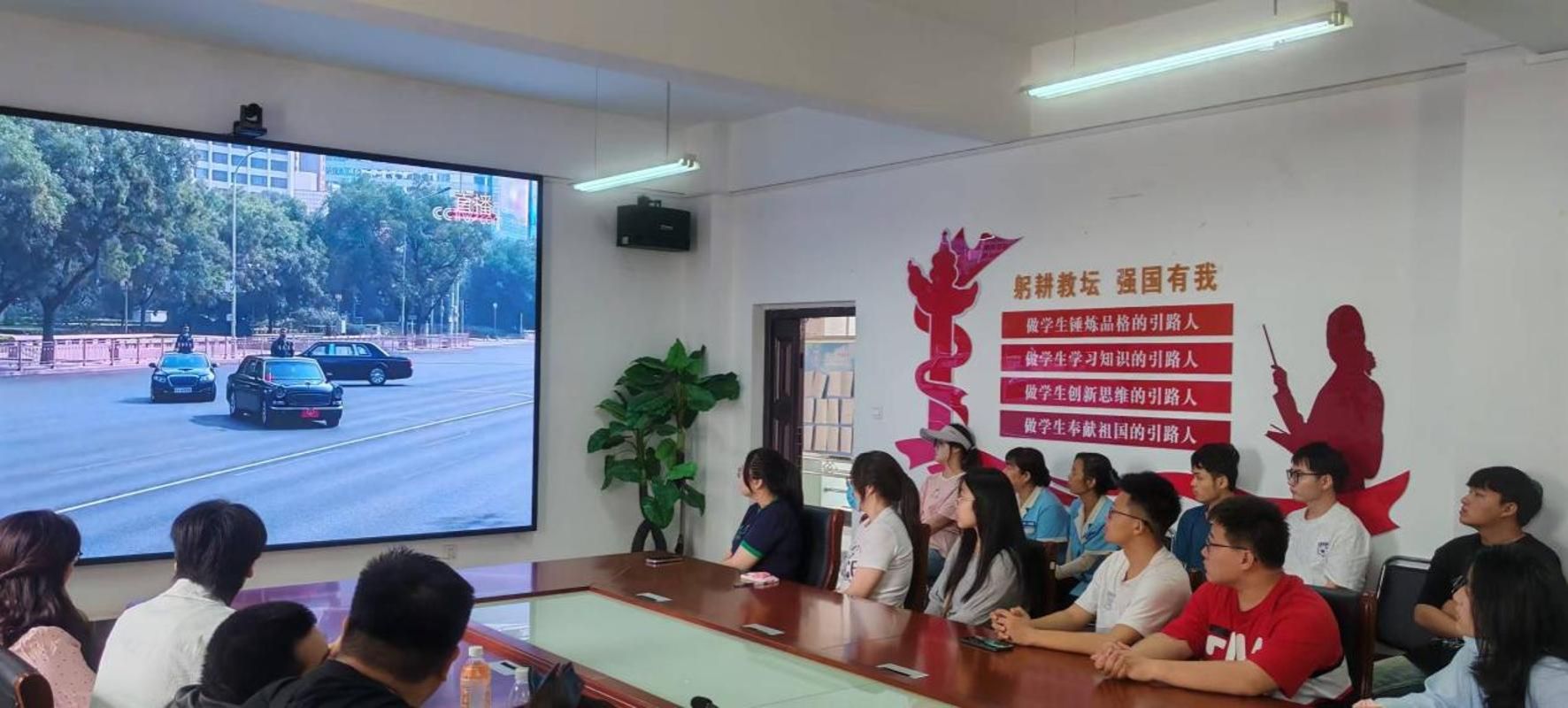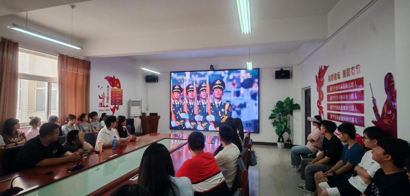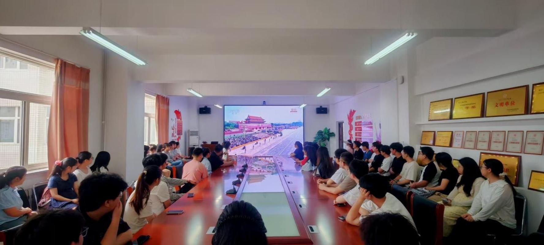 在校师生聚集在会议室,集体观看盛大的九三阅兵直播。